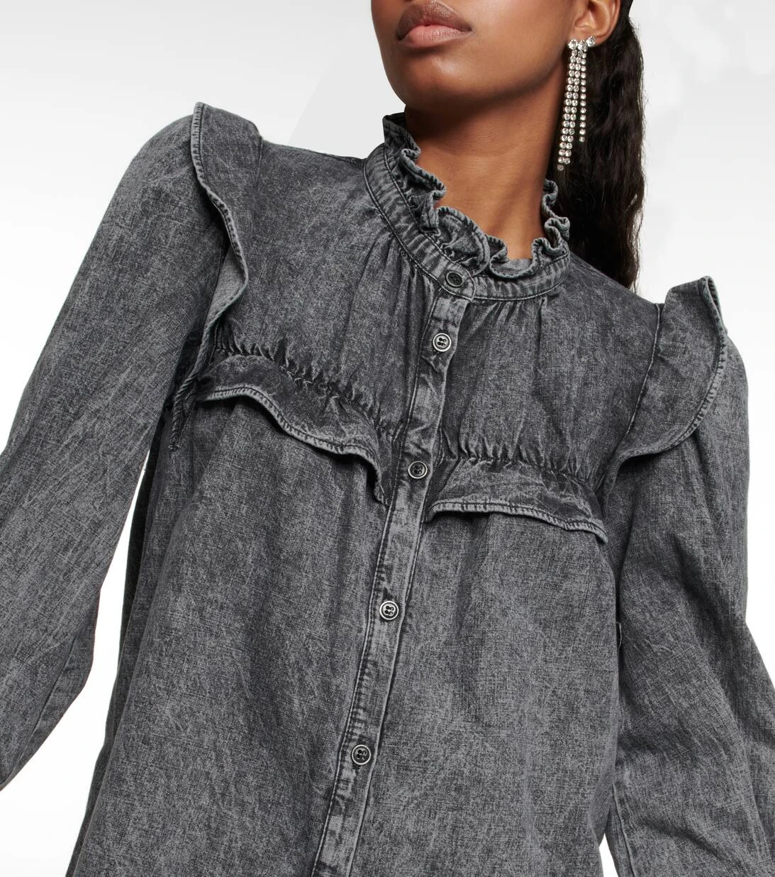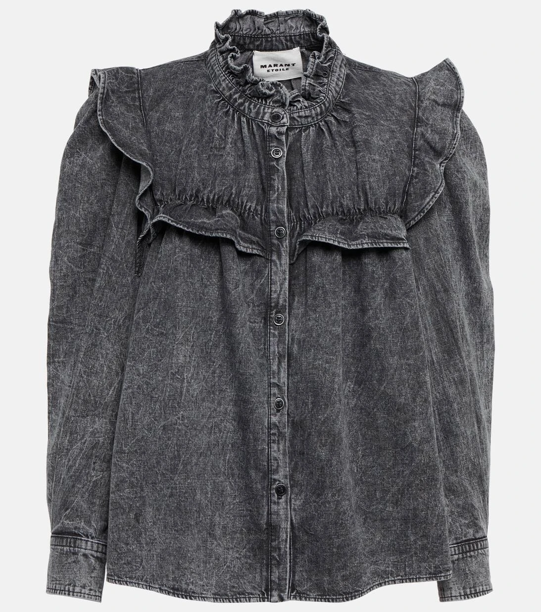 Die geknöpfte Idety Bluse von Isabel Marant, Étoile aus reiner Baumwolle in klassischem Grau zeigt sich mit äußerst voluminösen Ärmeln und Rüschendetails entlang des Kragens, des Oberteils und der Schultern.