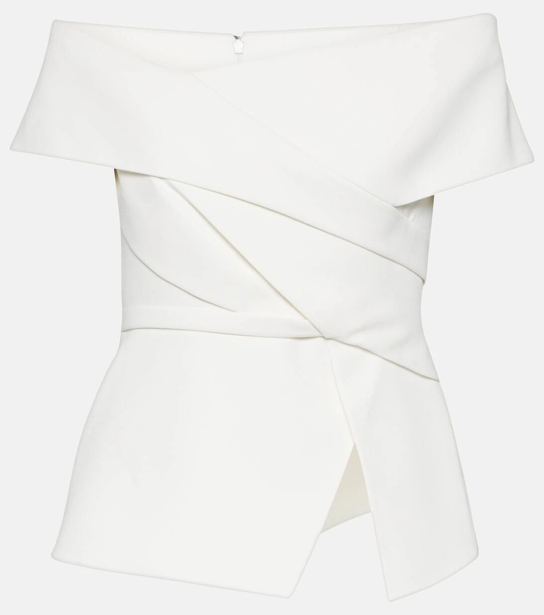 Das Eimear Top aus schwerem Crêpe mit gefalteter Off-Shoulder-Silhouette und Schlitz am Schößchensaum stammt aus der Brautkollektion von Safiyaa.