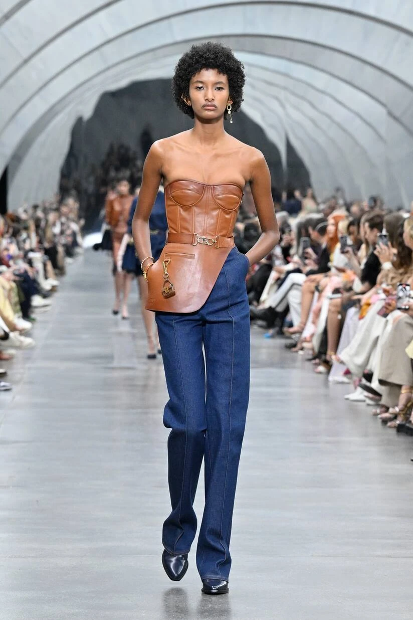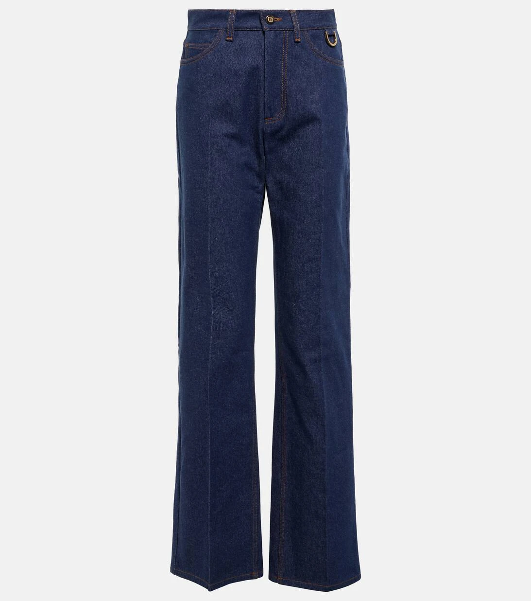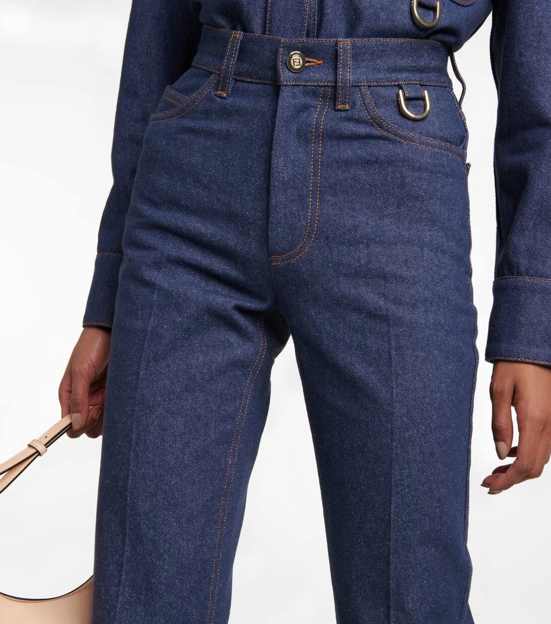 Von der Herrengarderobe inspirierte Schnitte, wie diese Jeans von Fendi mit weitem Bein und mittelhohem Bund, definieren jetzt die Looks der Saison. Das dunkelblaue Design wird durch kontrastierende Nähte und Bügelfalten weiter unterstrichen.