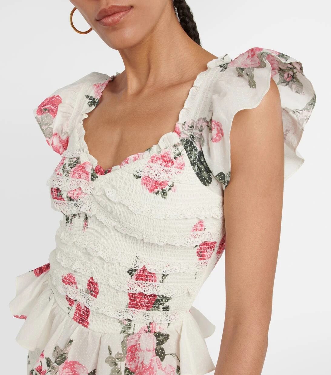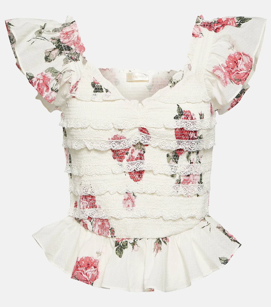 Das Compass Top von LoveShackFancy sorgt für mühelos feminine Looks. Das Design aus Baumwolle mit einem nostalgischen Blumenprint besticht durch einen gesmokten herzförmigen Ausschnitt, gerüschte Ärmel und ein Schößchen.