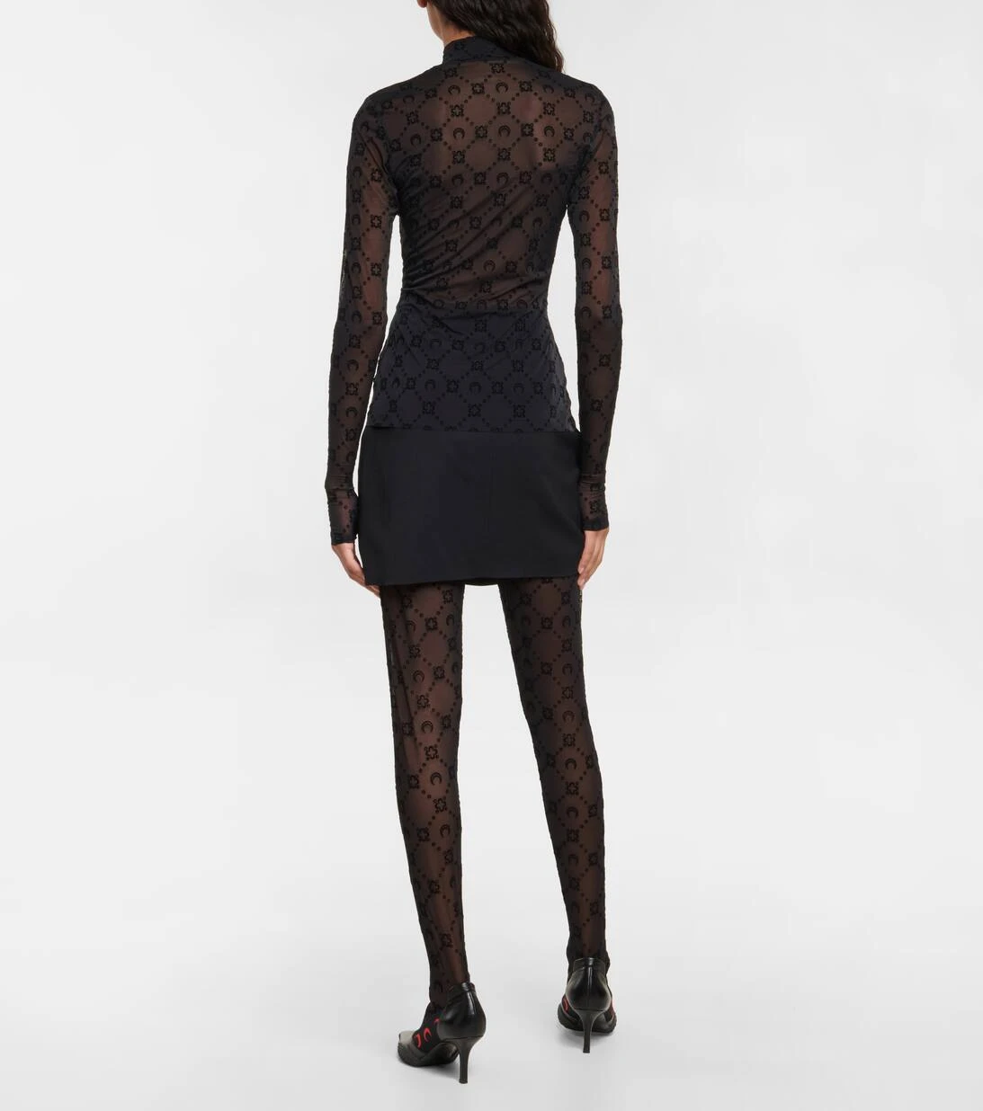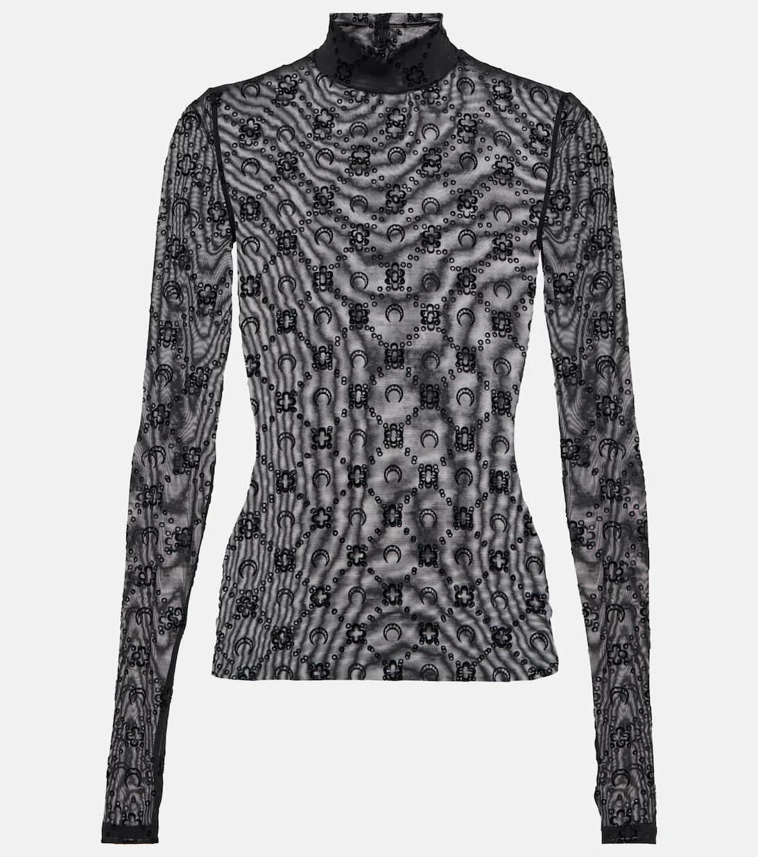 Das Moonogram Top zeigt eine aktualisierte Version des berühmten Halbmonds von Marine Serre. Es wurde in Frankreich aus schwarzem Mesh mit recycelten Nylonfasern gefertigt und durchgehend mit einem geflockten Muster versehen.