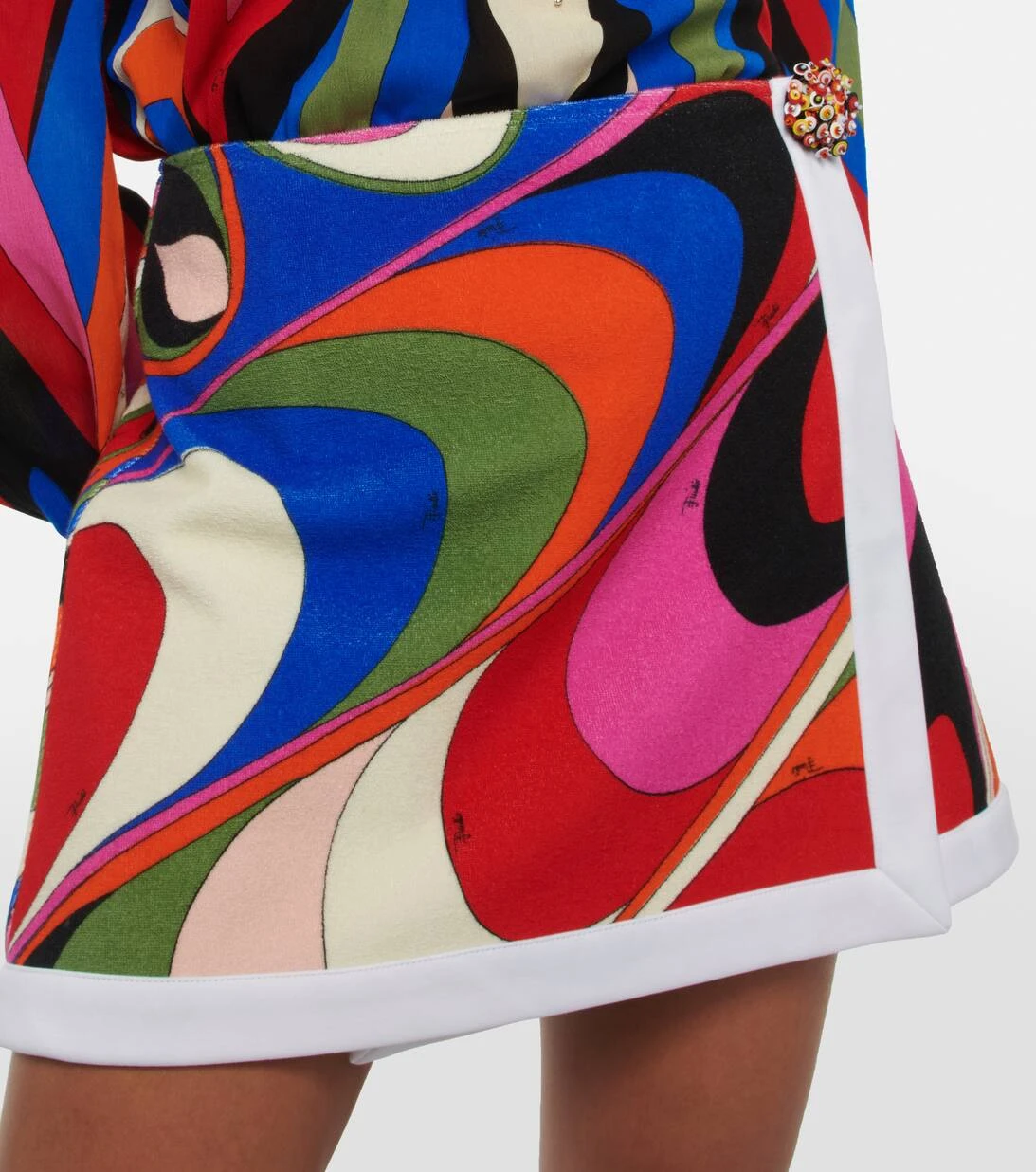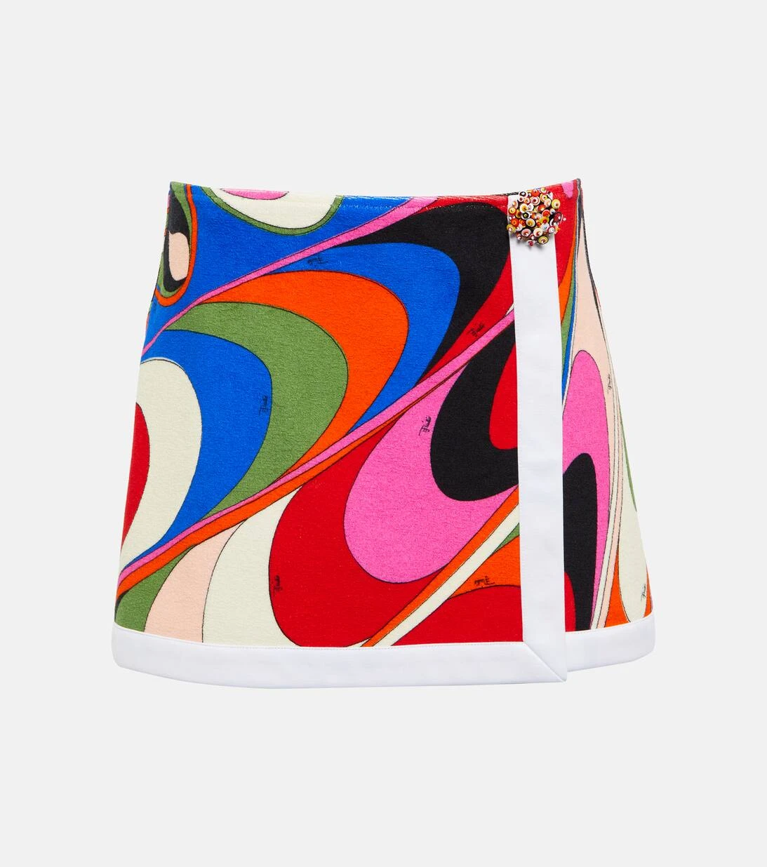 Bringen Sie mit diesem psychedelischen Minirock von Pucci frischen Wind in Ihre Partygarderobe. Das gewickelte Frottee-Design aus einem Baumwollgemisch besticht mit einem auffälligen Grafik-Print und wird durch einen perlenverzierten Knopf an der Seite abgerundet.