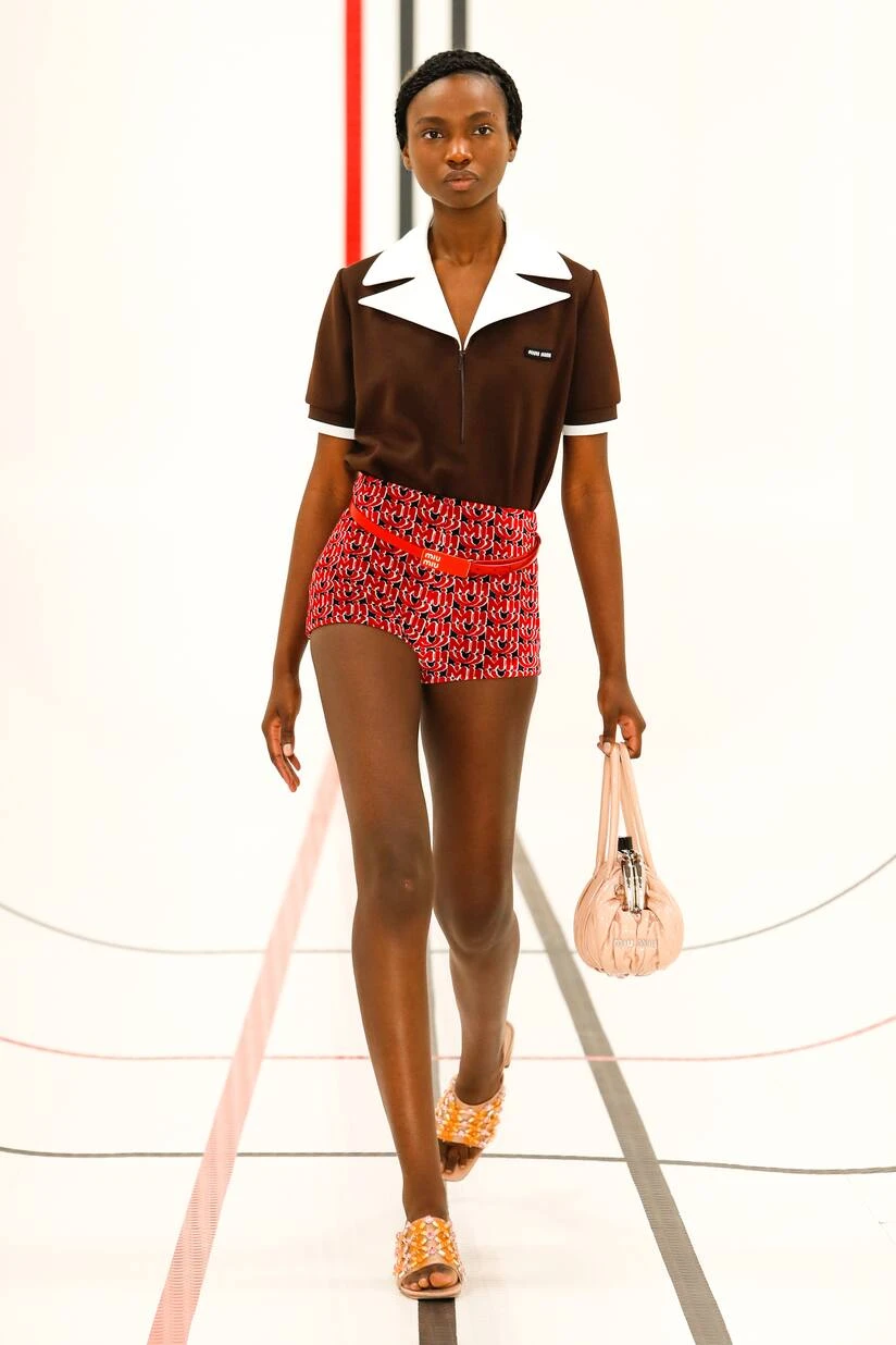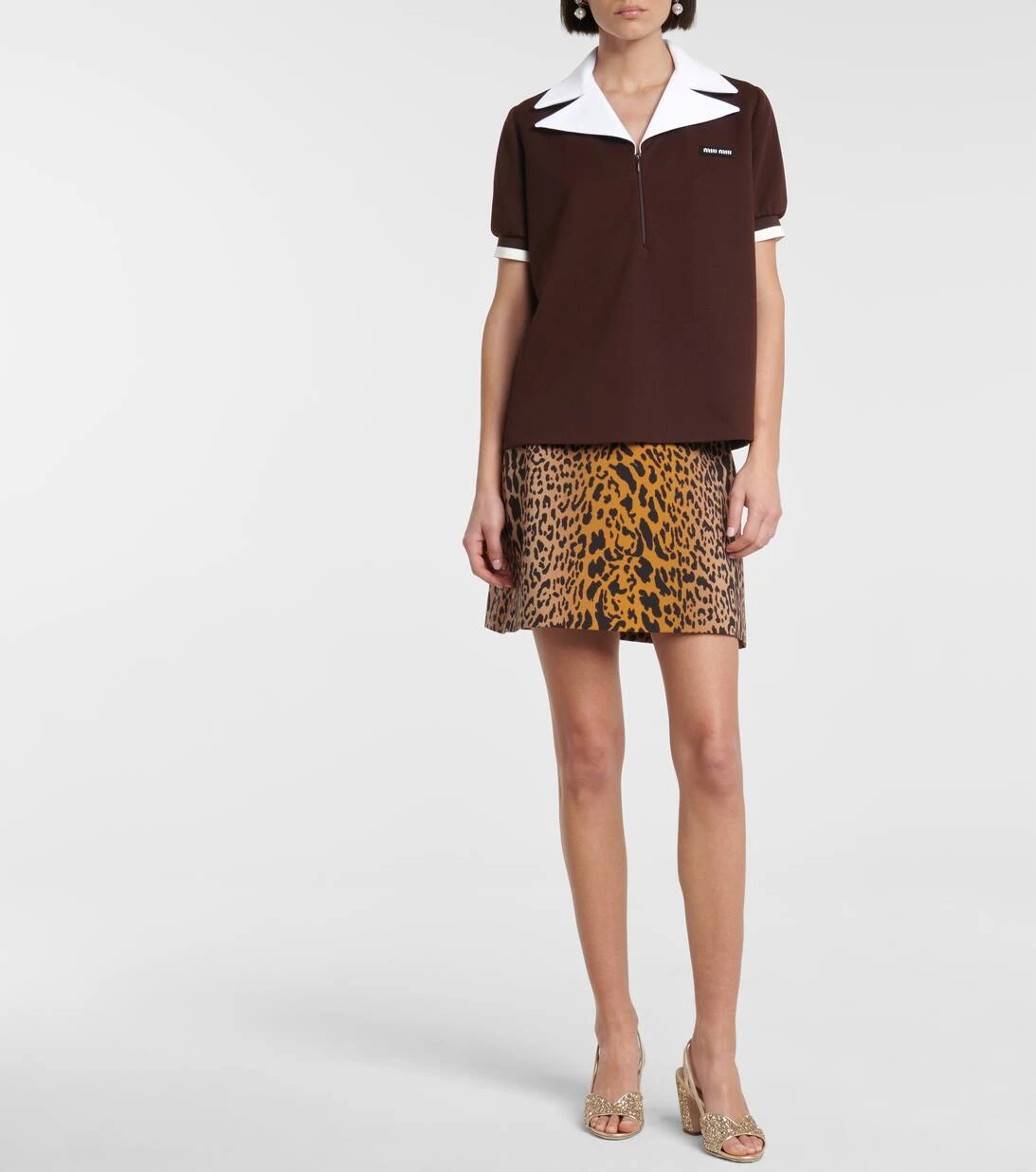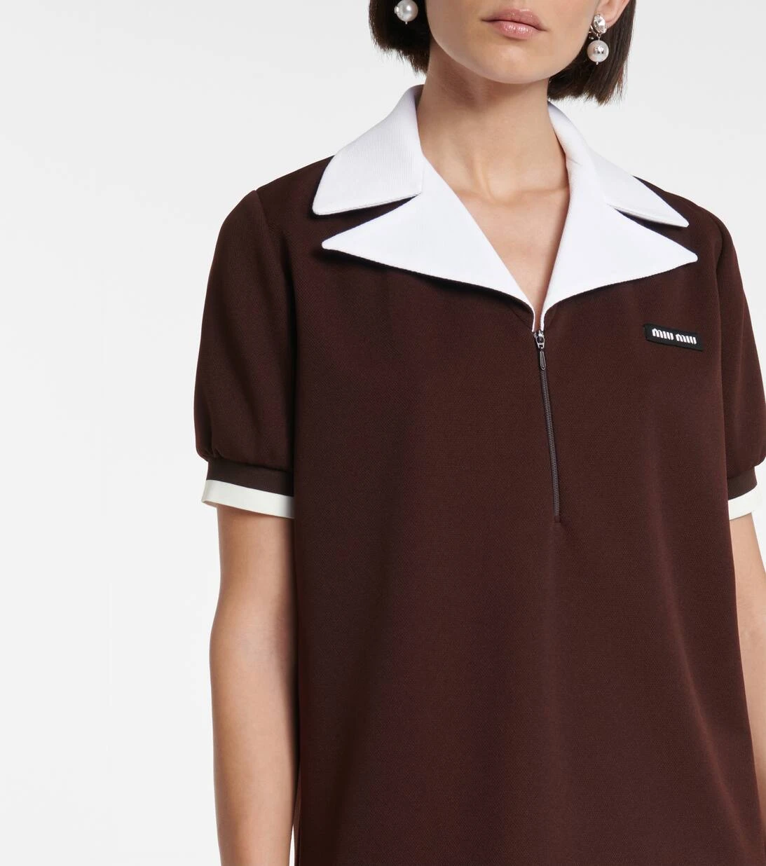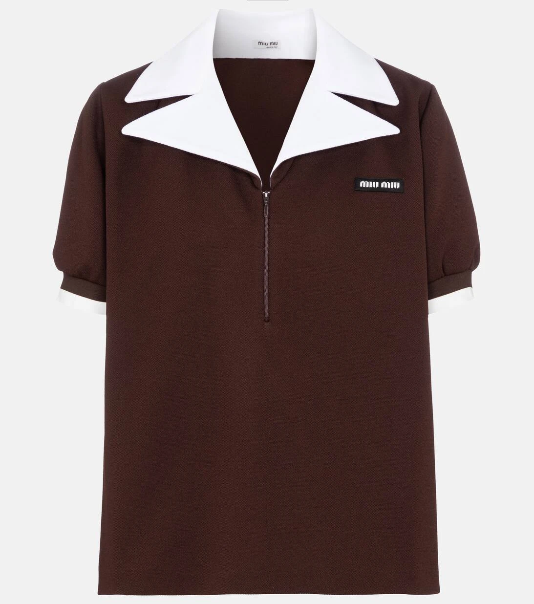 Das sportliche Poloshirt erhält bei Miu Miu nun ein feminines Update. Dabei wurde das kastenförmig geschnittene Modell in Italien aus klassischem Piqué in einem rötlichen Braun gefertigt und mit einem spitzen Kragen sowie Ärmelbündchen in kontrastierendem Weiß ausgestattet. Die gepufften Ärmel und das Designer-Logo sorgen dabei für einen spannenden Abschluss. Lassen Sie den kurzen Reißverschluss nach Belieben auch einmal offen, um Ihre Halsketten zu präsentieren.