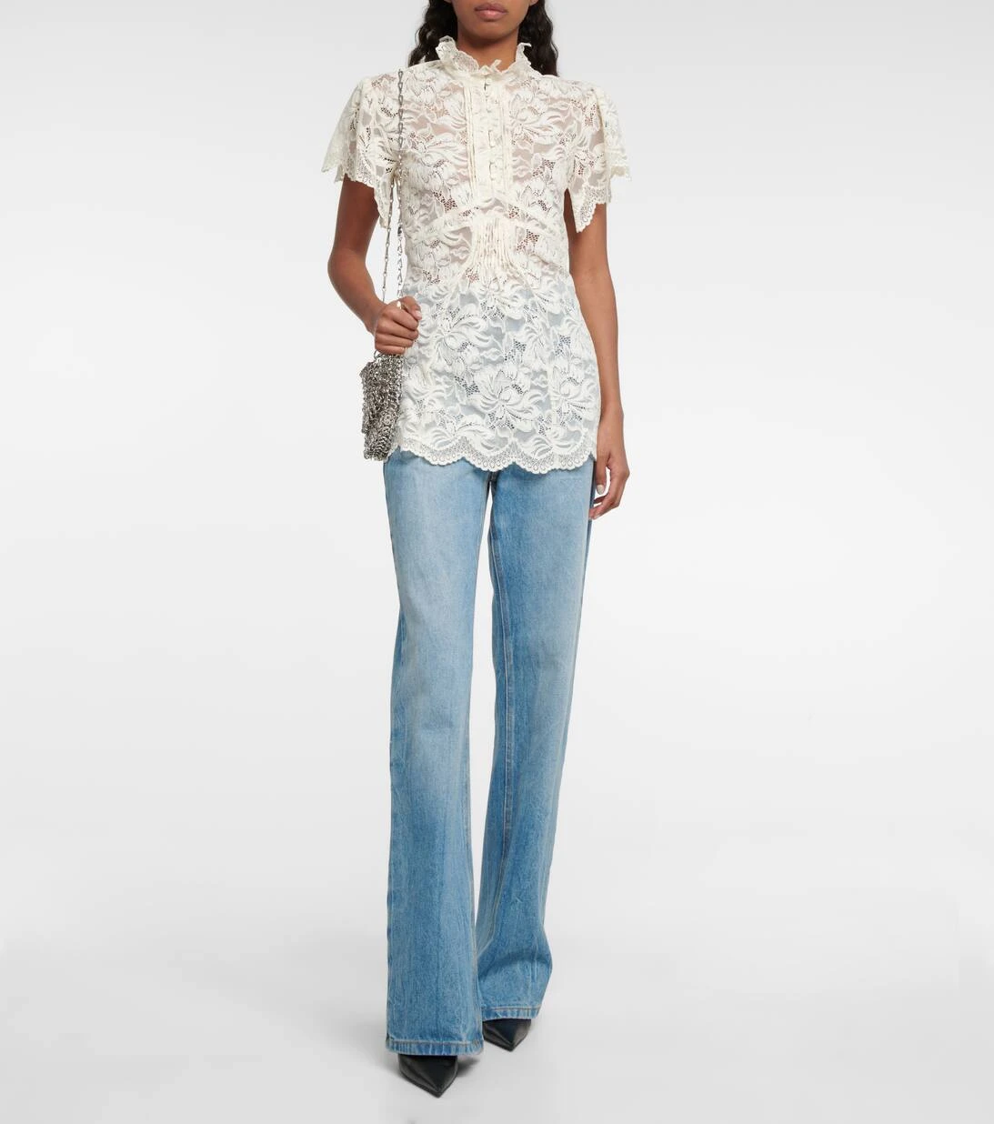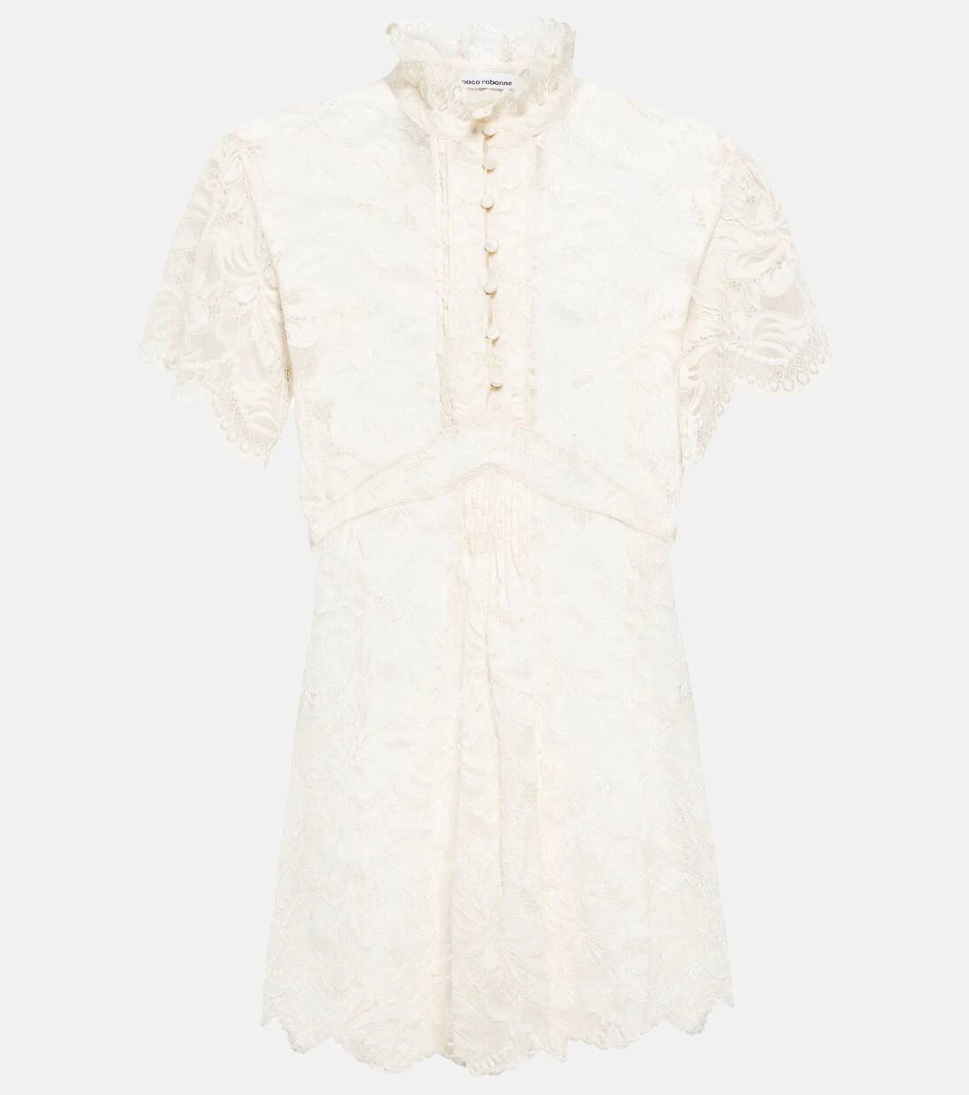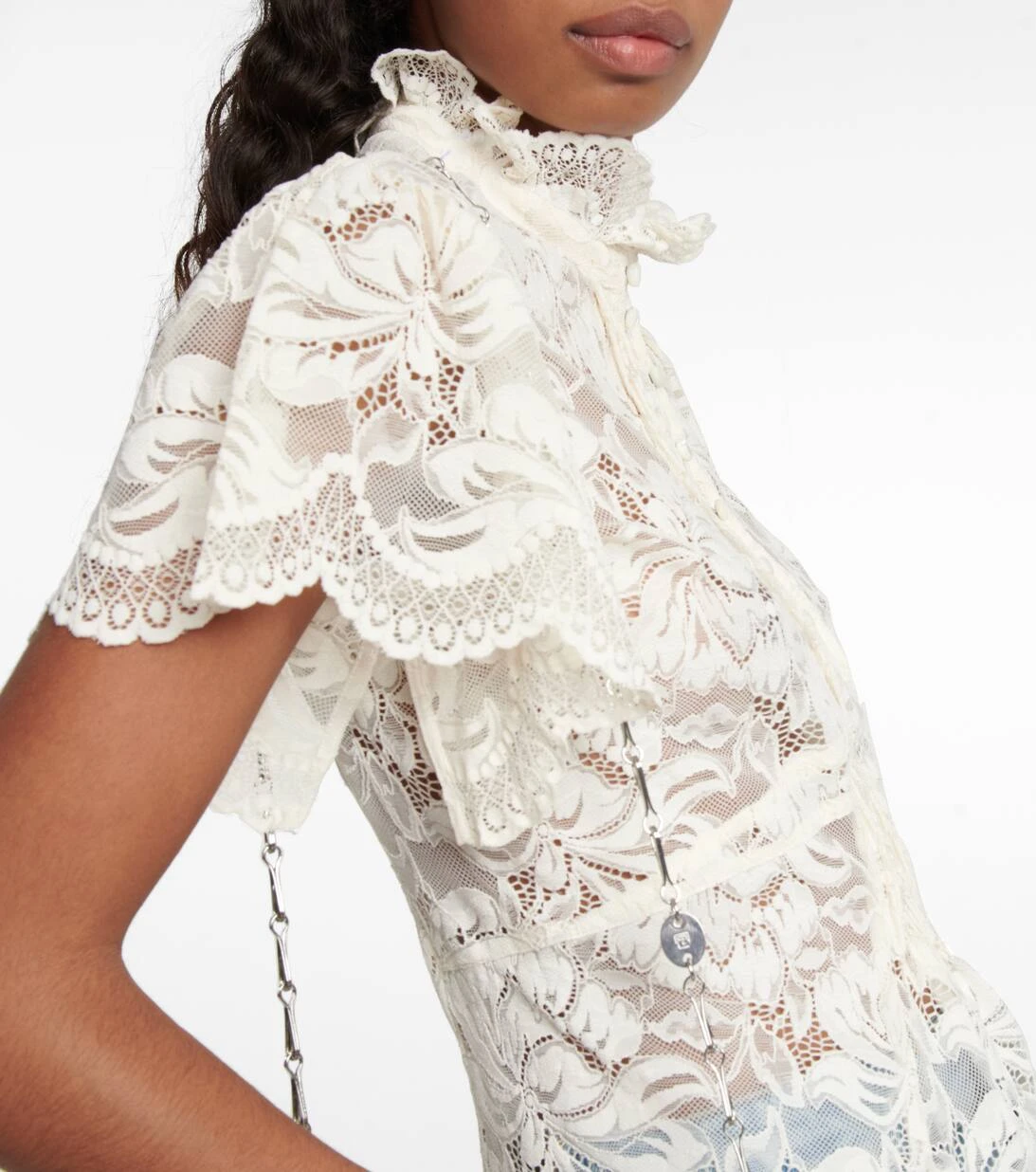 Aktualisieren Sie Ihre Kollektion an romantischen Blusen mit diesem Modell aus floraler Spitze von Paco Rabanne. Das kurzärmelige weiße Design hat einen langen Schnitt und ist mit Wellenkanten versehen.