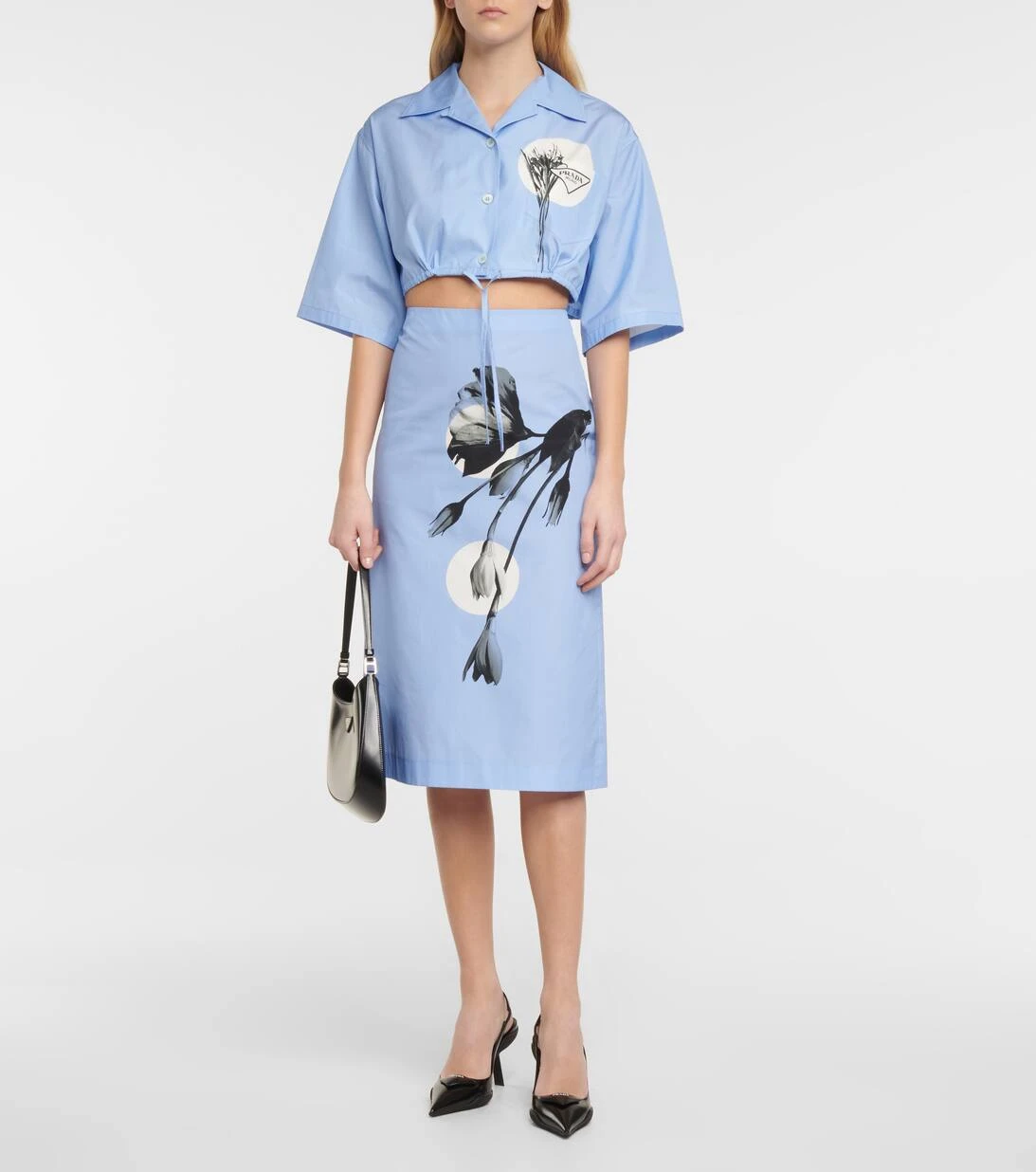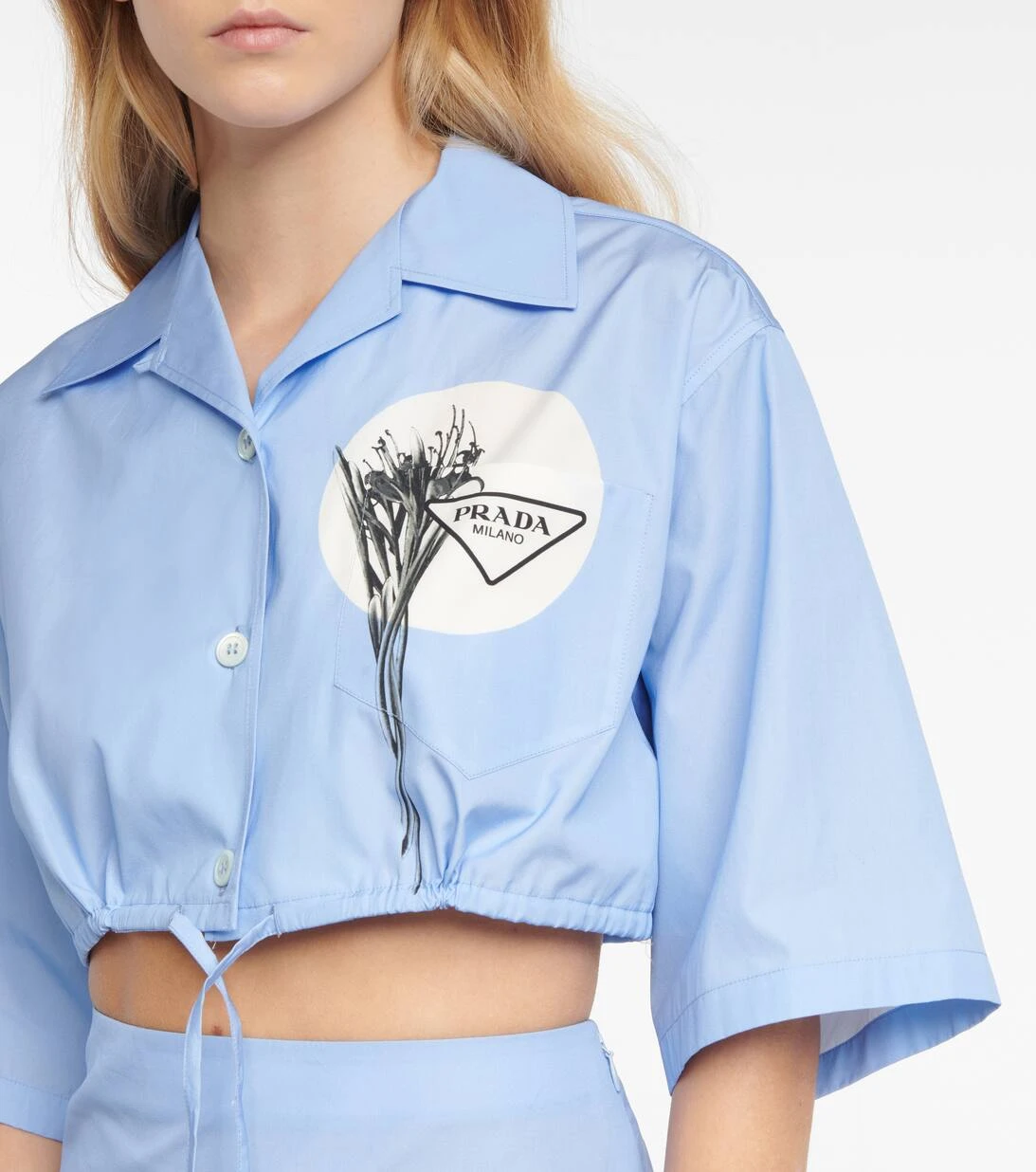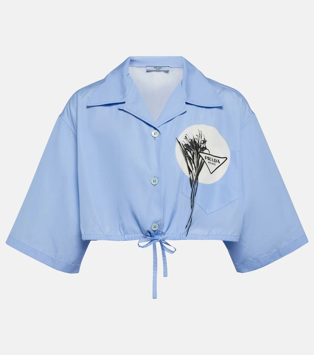 Prada verleiht dem klassischen Hemd einen komplett neuen Look. Dabei wurde das hellblaue Modell in Italien aus luftiger Baumwolle gefertigt und mit kurzen Ärmeln sowie einem Zugband am Cropped-Saum versehen. Ein minimalistischer Blumenprint samt dem Logo des Hauses rundet das Design ab.