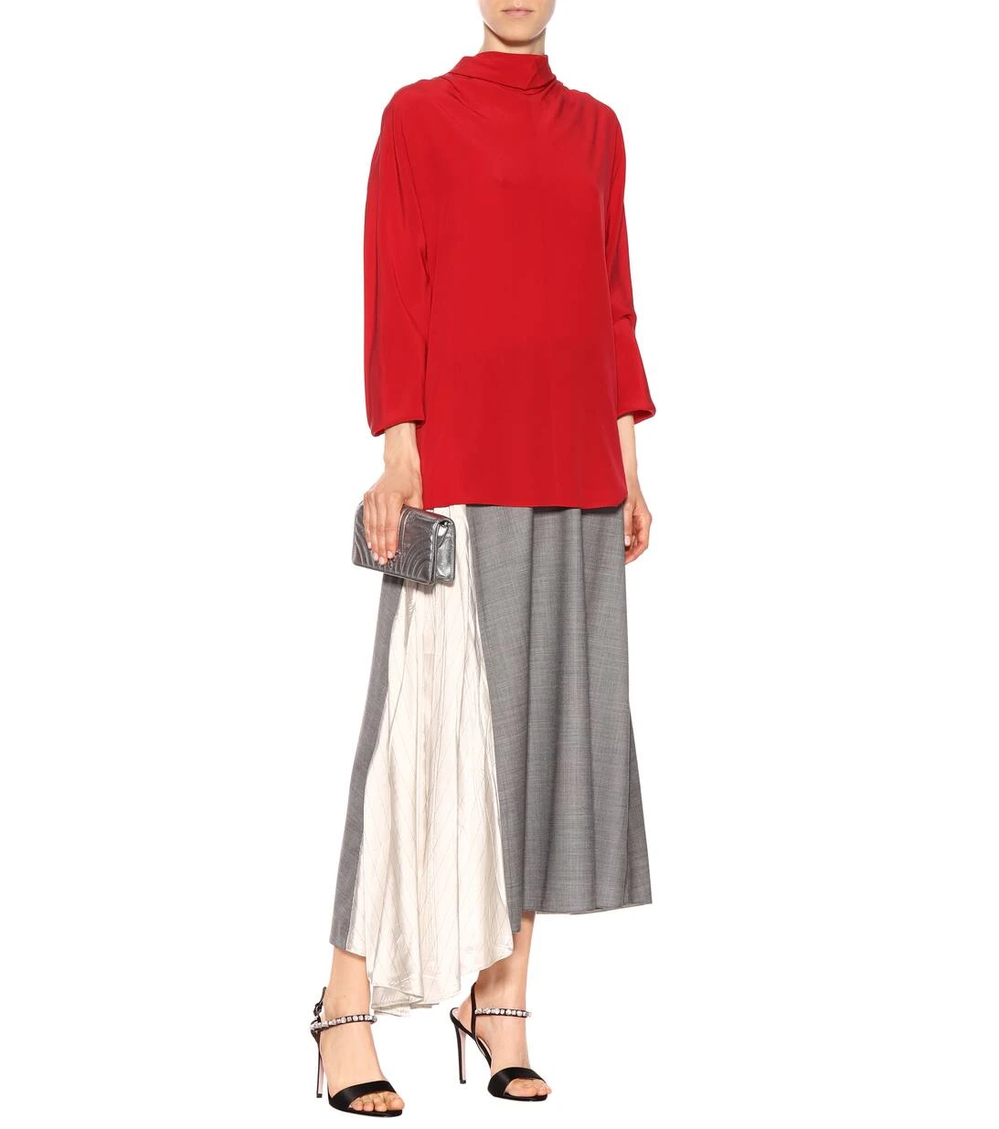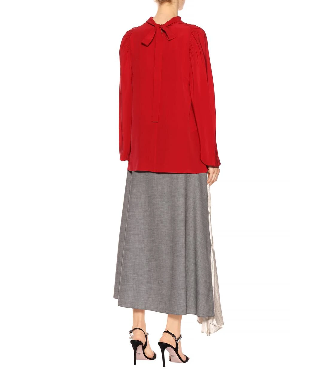 Dieses locker geschnittene Longsleeve von Prada wurde in Italien aus zartem Seiden-Crêpe de Chine in einem kräftigen Rot gefertigt. Der umgeschlagene, hochgeschlossene Kragen wird dabei an der Rückseite zu einer Schleife gebunden und setzt so einen stilvollen Akzent. Tragen Sie etwa einen langen Plissee-Rock sowie elegante Sandalen dazu.