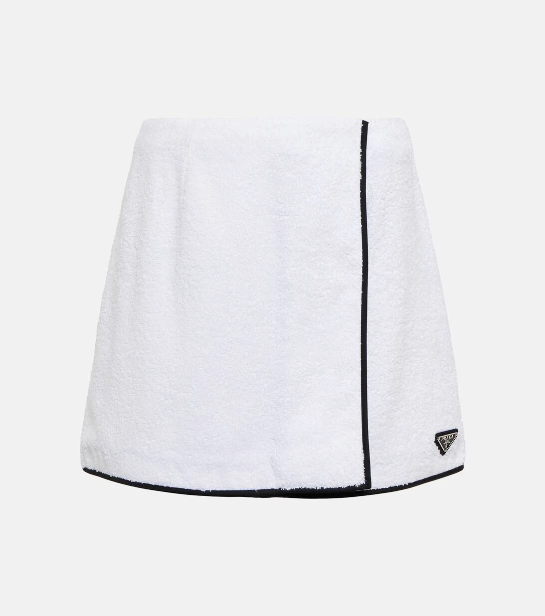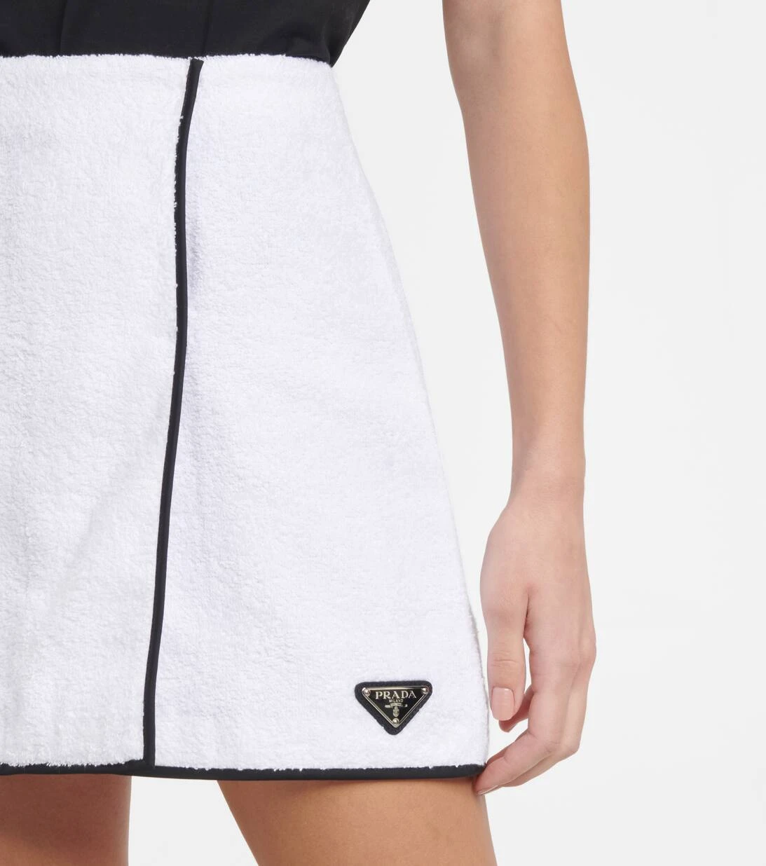 Der weiße Minirock von Prada erinnert an klassische Modelle aus dem Tennissport. Das Design wurde aus weichem Baumwollfrottee gefertigt und in einer Wickelsilhouette samt kontrastierender Paspelierung gestaltet. Auch hier darf das Logo nicht fehlen.