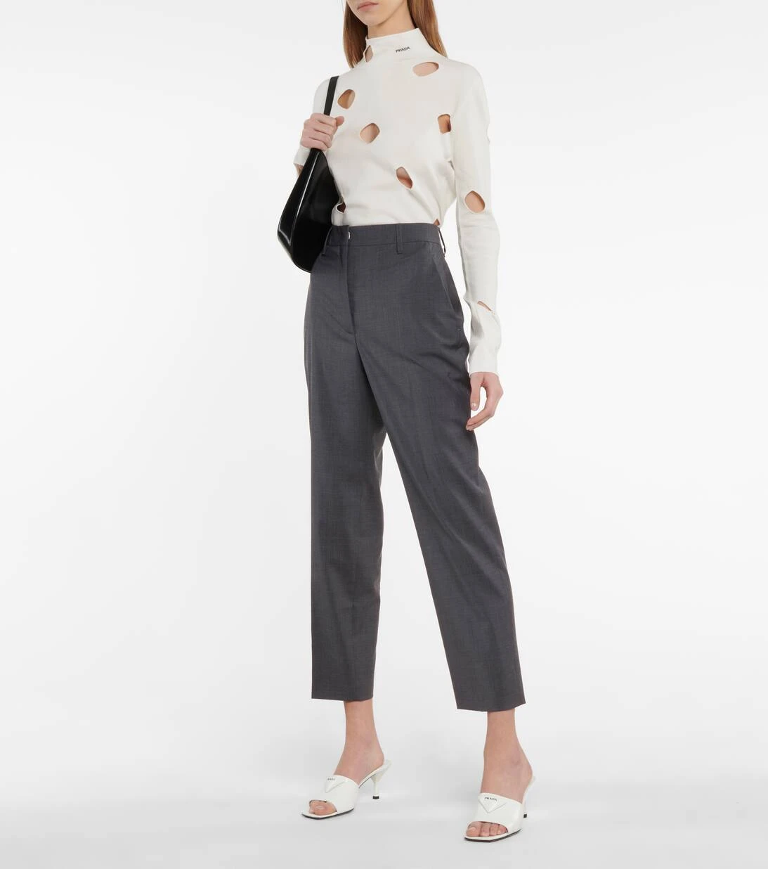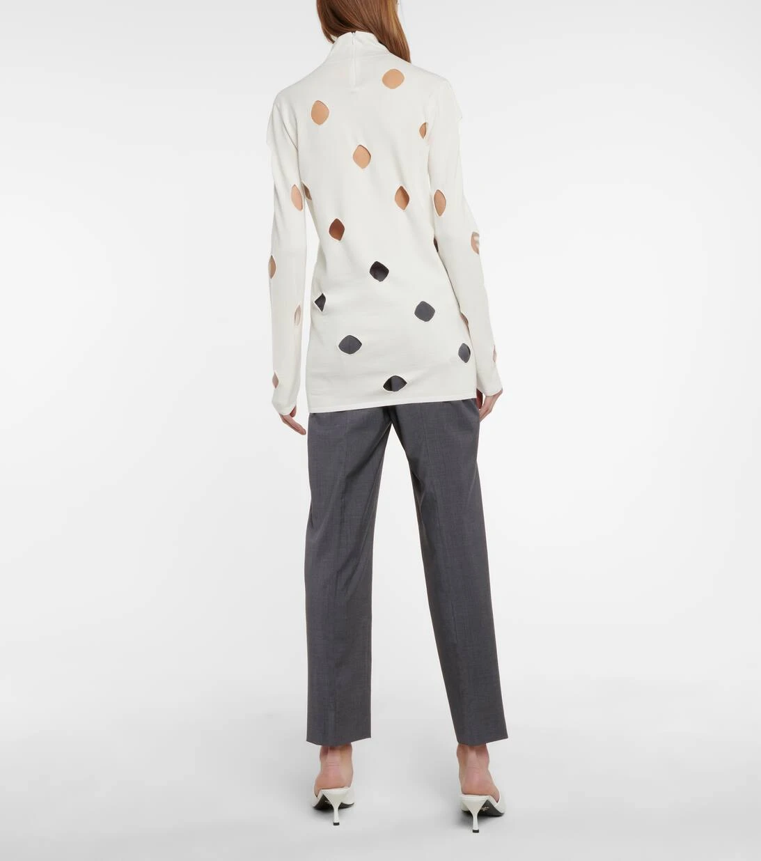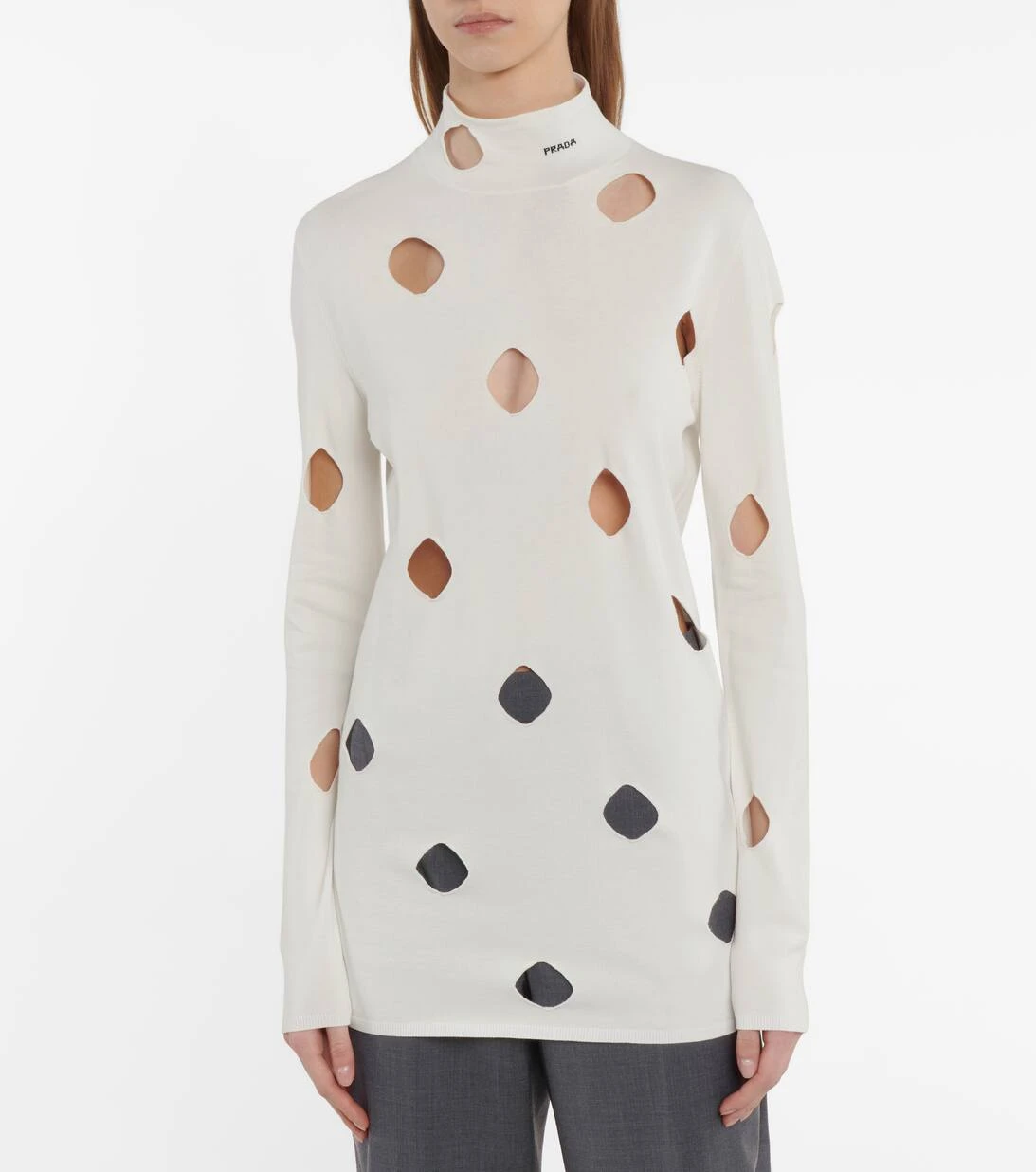 Die Kollektionen von Prada überraschen uns stets mit einer Kombination aus klassisch-elegant und modern-hybrid, wie man auch bei diesem weißen Top erkennen kann. Dabei wurde bei der Herstellung auf elastisches Jersey zurückgegriffen, das für einen enganliegenden Fit sorgt. Das in Italien gefertigte Modell wird von einem Stehkragen und Cut-outs definiert, die für einen dekonstruierten Appeal sorgen. Tragen Sie einen voluminösen Midirock und die Sneakers der Brand dazu.