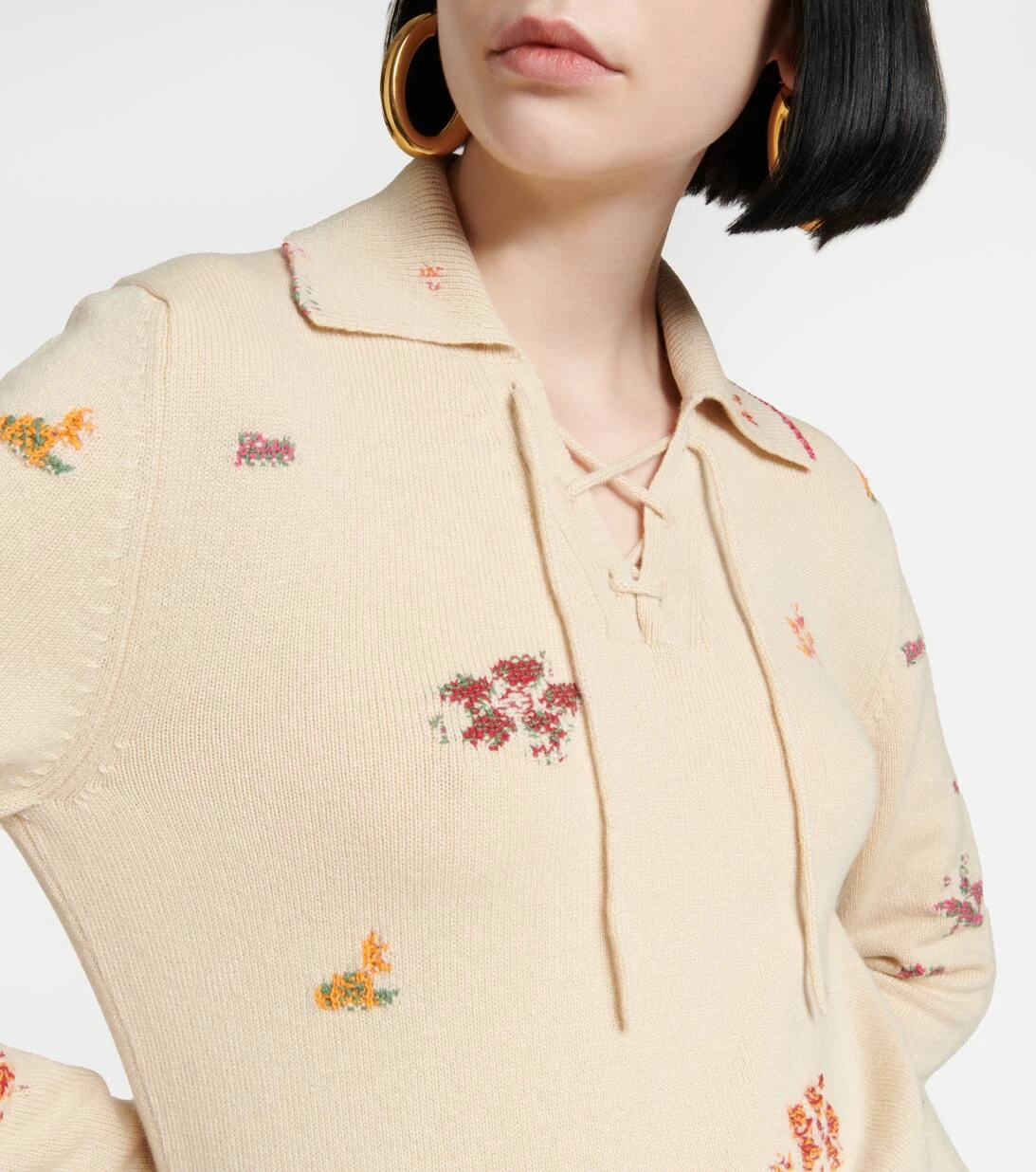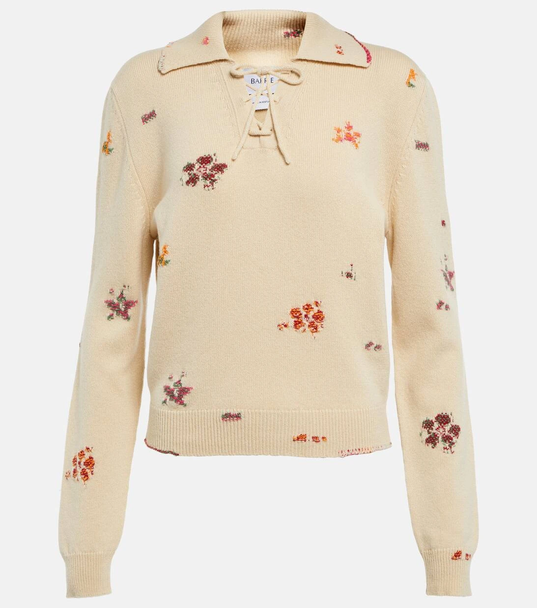 Entdecken Sie die Kunst des „Mending“ mit diesem dekonstruierten Pullover von Barrie, der die Pastelltöne der neuesten Kollektion präsentiert. Das in Schottland gefertigte Design aus Kaschmir und Baumwolle zeichnet sich durch Zierrisse mit Blumen- und Sonnenmotiven sowie einen geschnürten Ausschnitt aus.