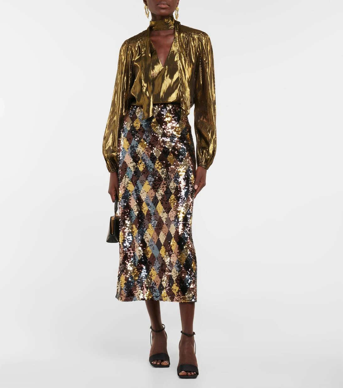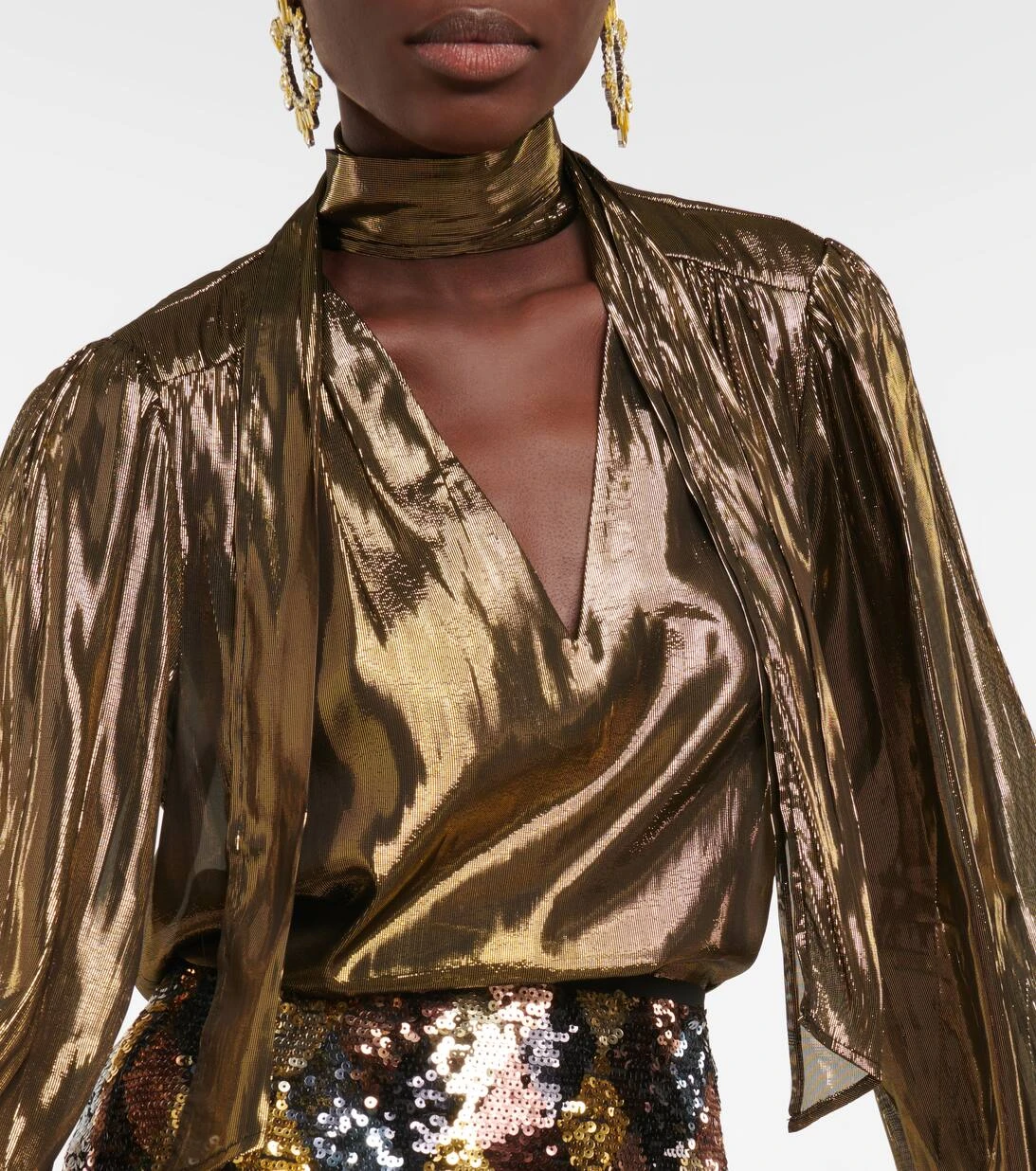 Die Moss Bluse von Rixo ist nach dem legendären Model Kate Moss benannt. Sie wurde aus einem Gemisch aus Metallic-Fasern gefertigt und verfügt über einen Schluppenkragen zum Binden sowie lange Ballonärmel.