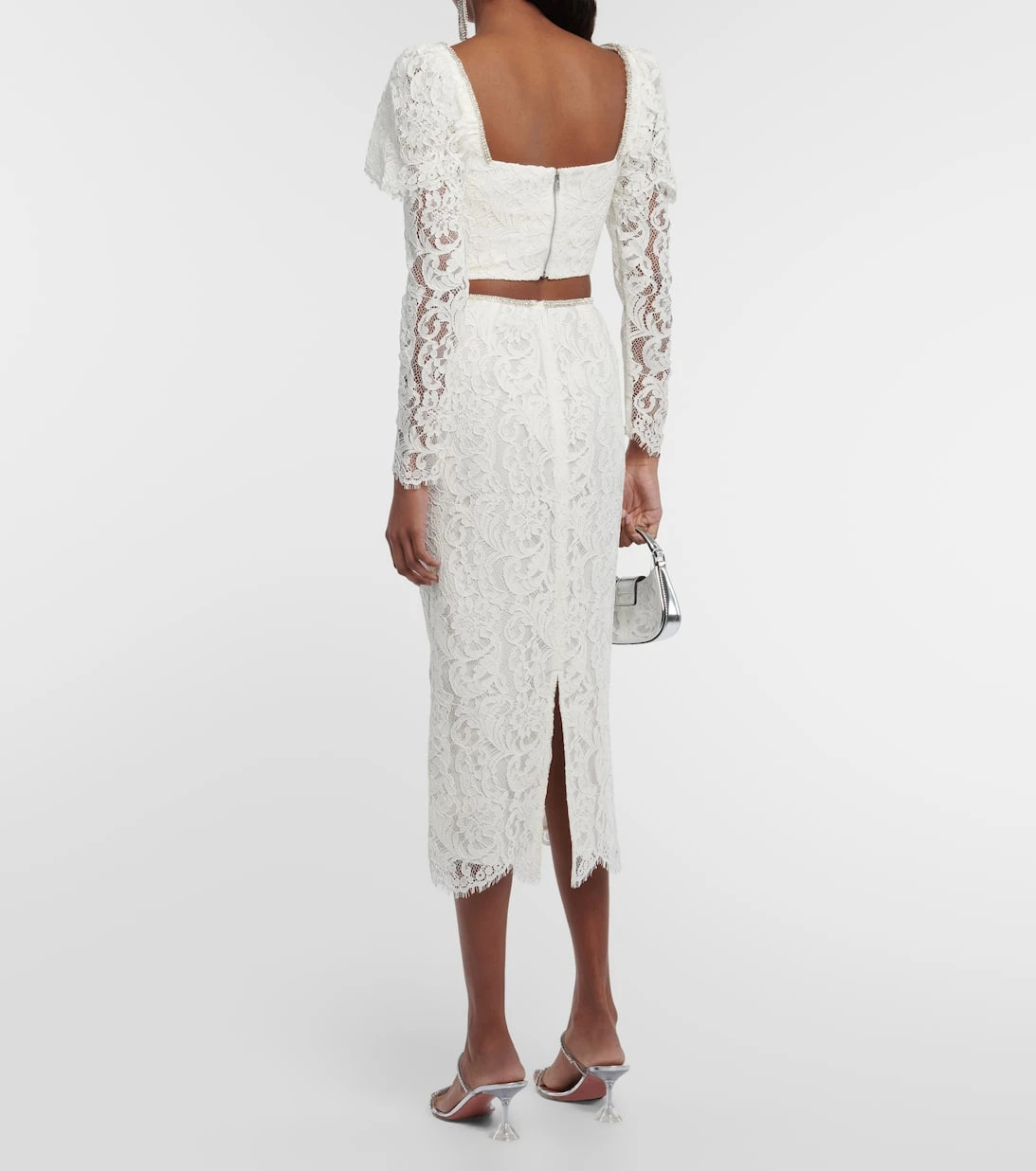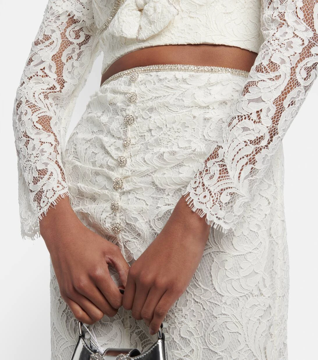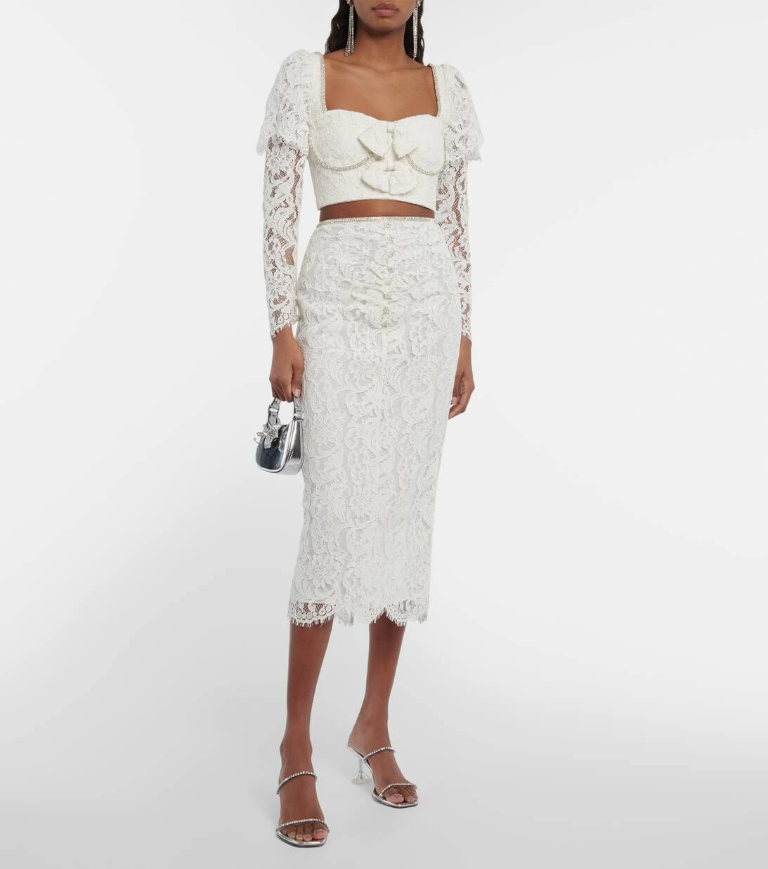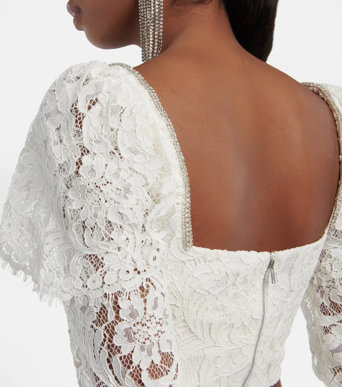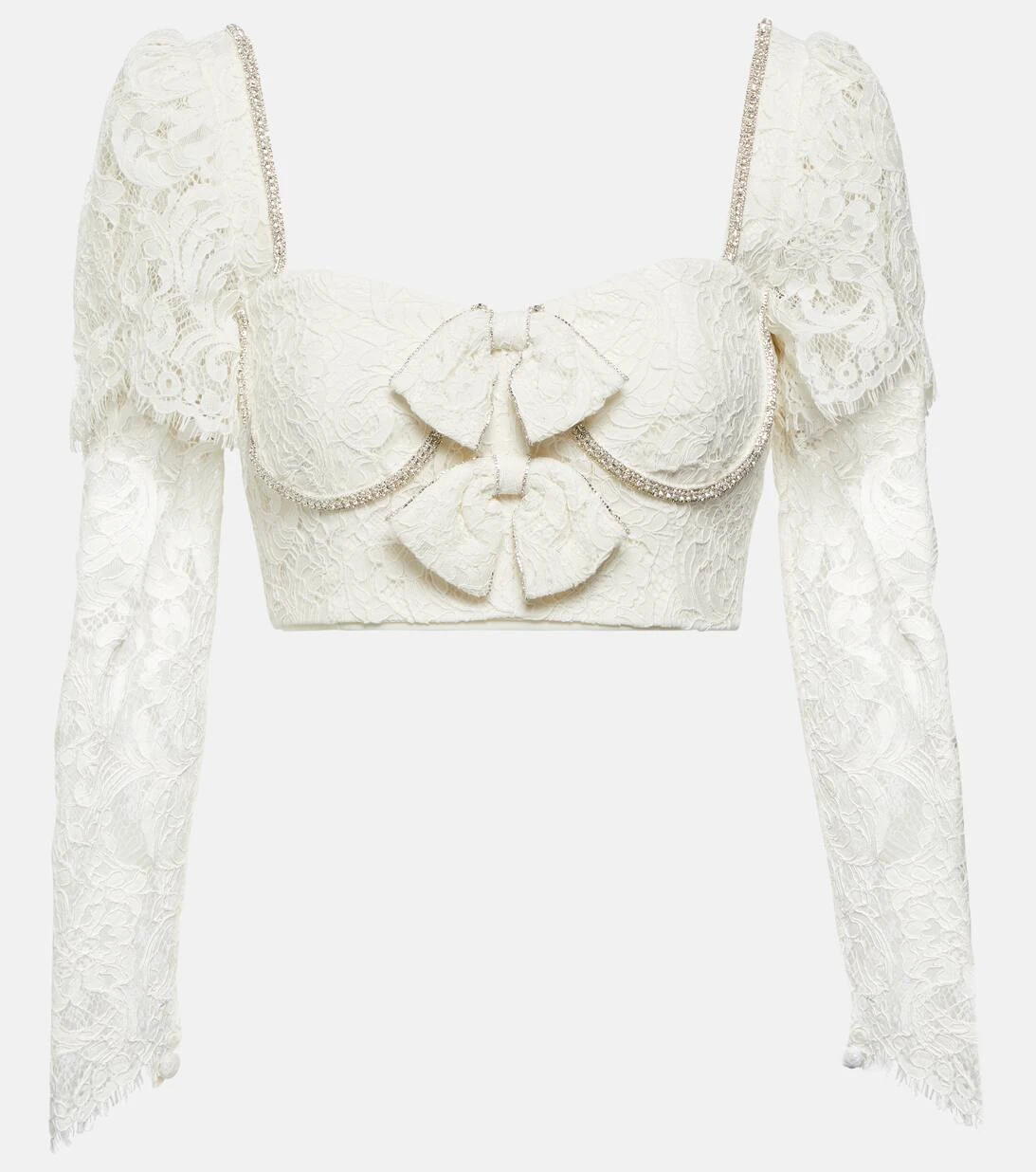 Dieses detailreiche Top von Self-Portrait strahlt romantische Eleganz aus. Das Cropped-Modell aus Kordelspitze verfügt über einen herzförmigen Ausschnitt mit Puffärmeln, Schleifen sowie funkelnde Kristallverzierungen.
