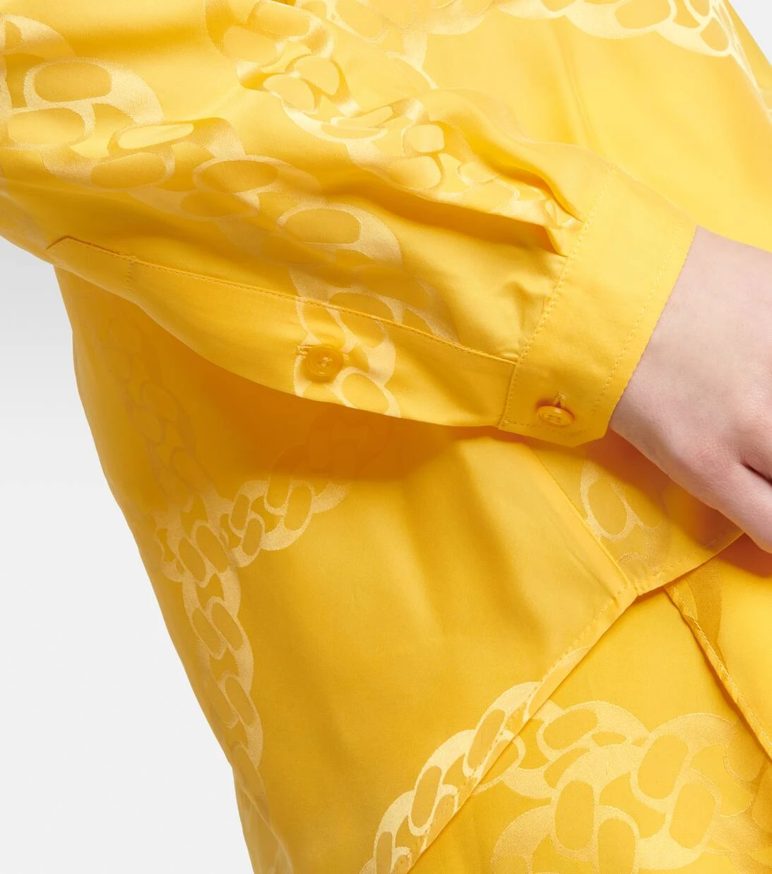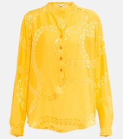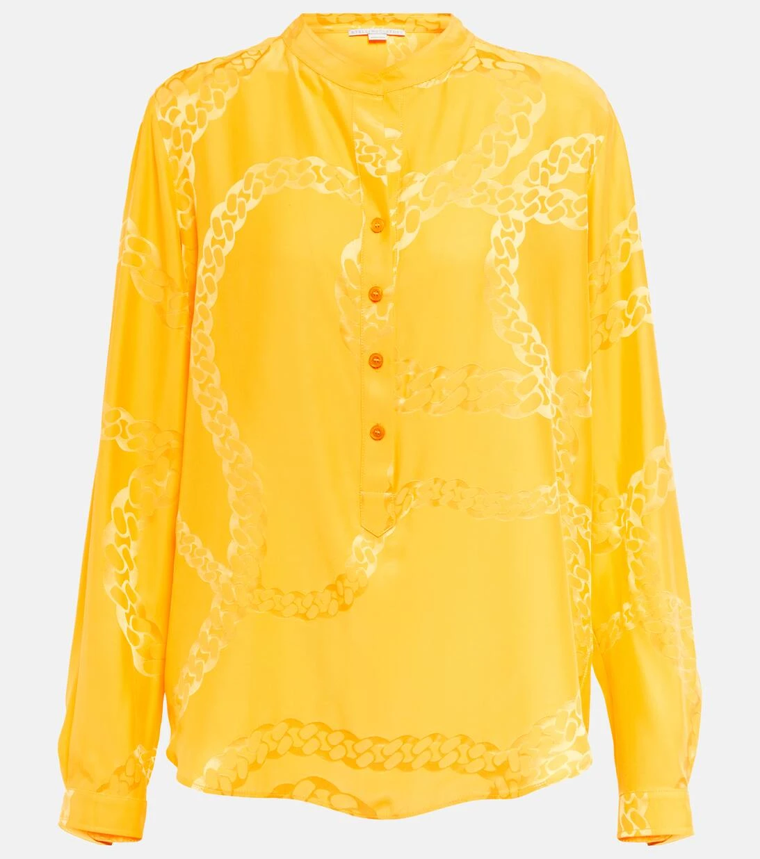 Dieses Hemd von Stella McCartney wurde aus einem glänzenden Seidengemisch gefertigt und mit einem Falabella-Kettenprint versehen. Das Modell verfügt über einen Stehkragen und eine teilweise geknöpfte Vorderseite.