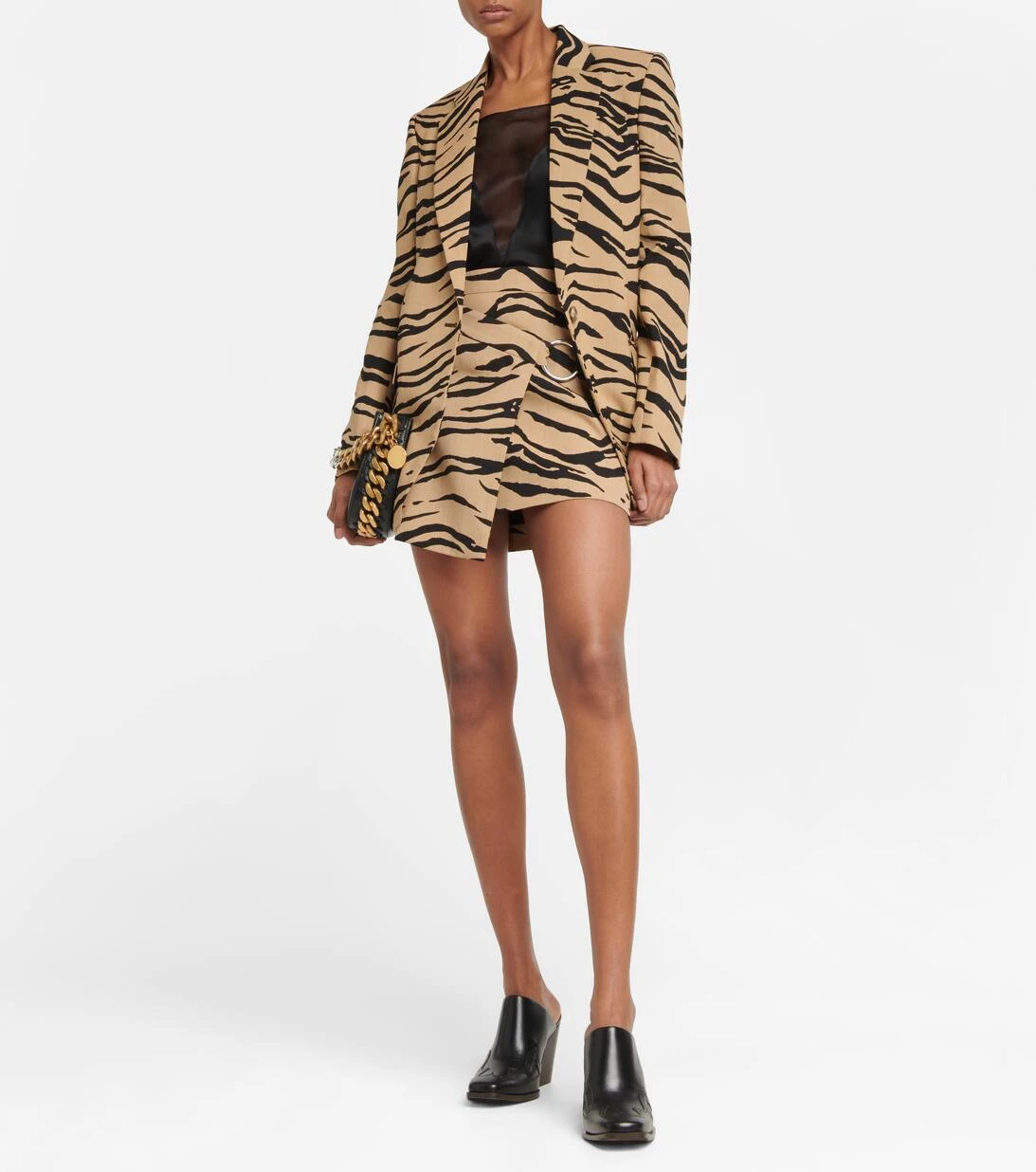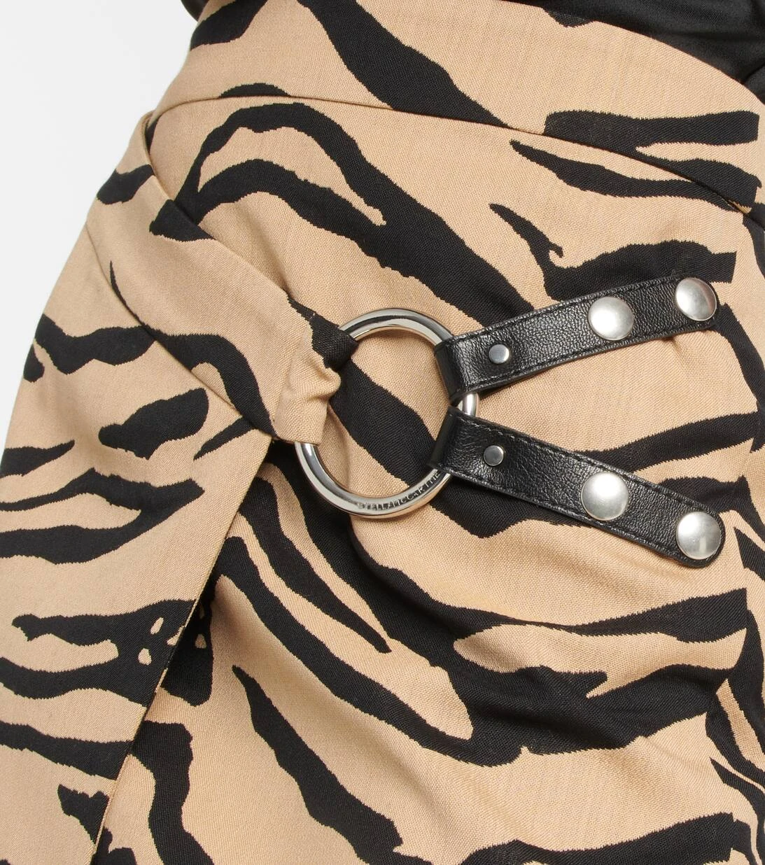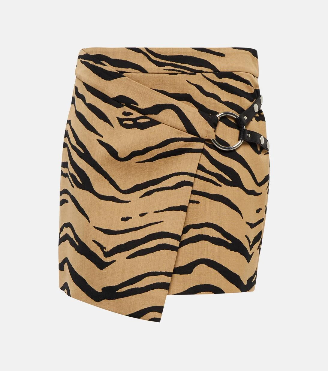 Dieser Minirock von Stella McCartney wurde aus einem Wollgemisch gefertigt und mit einem markanten, durchgehenden Tiger-Print versehen. Die moderne Wickelsilhouette wird von einer ringförmigen Schnalle an der Seite abgerundet.