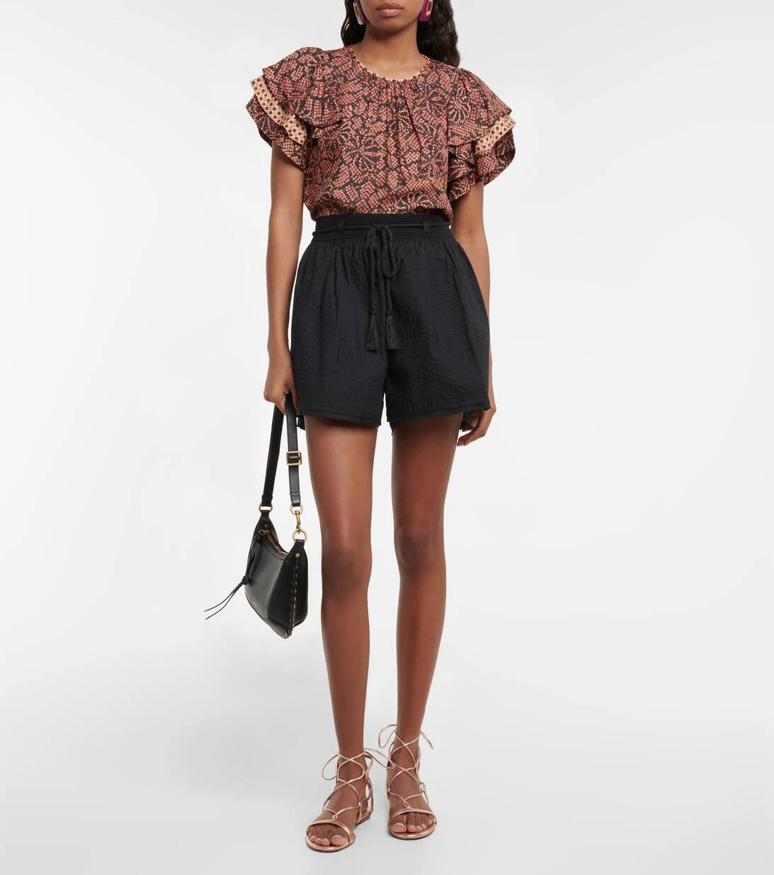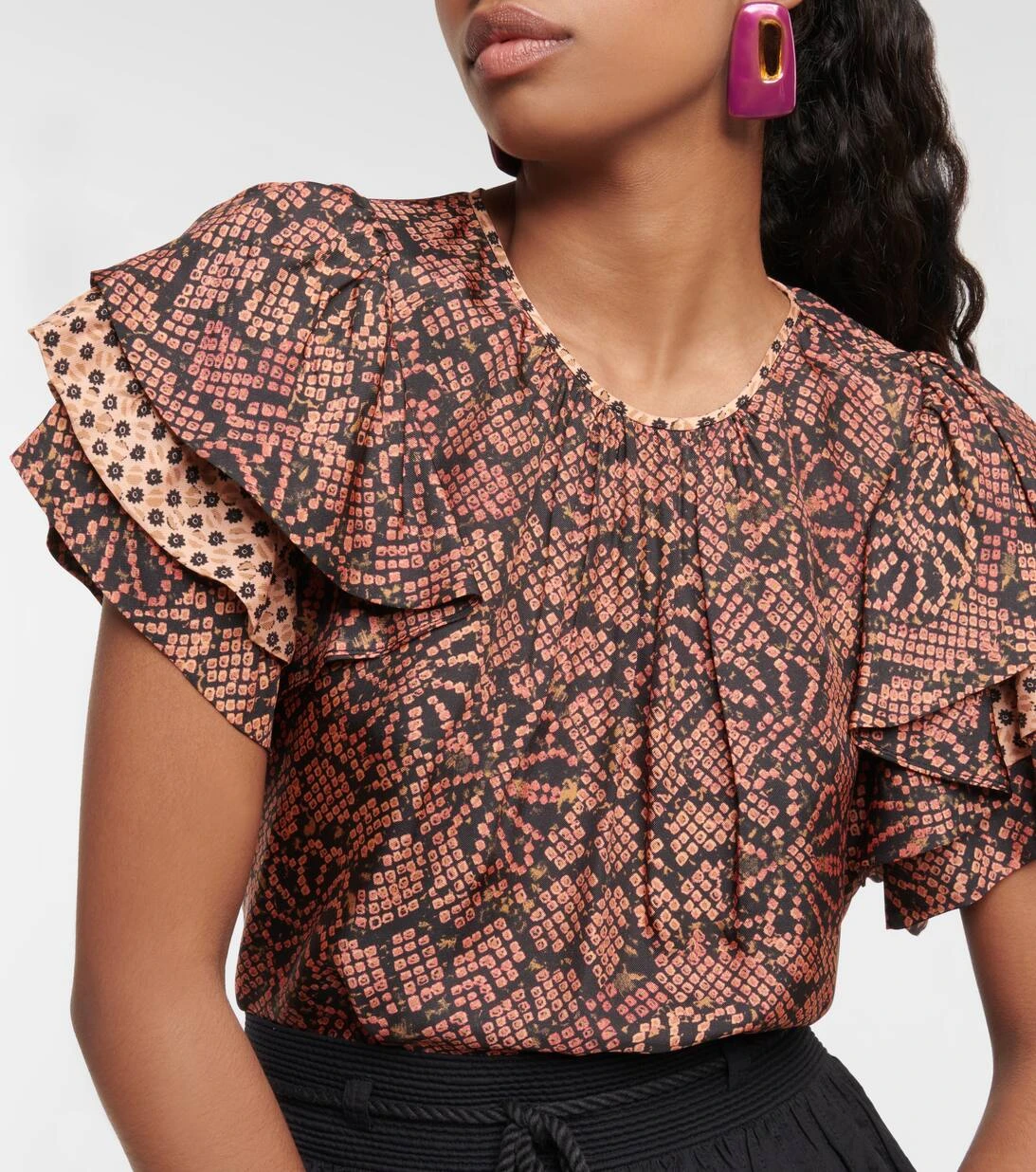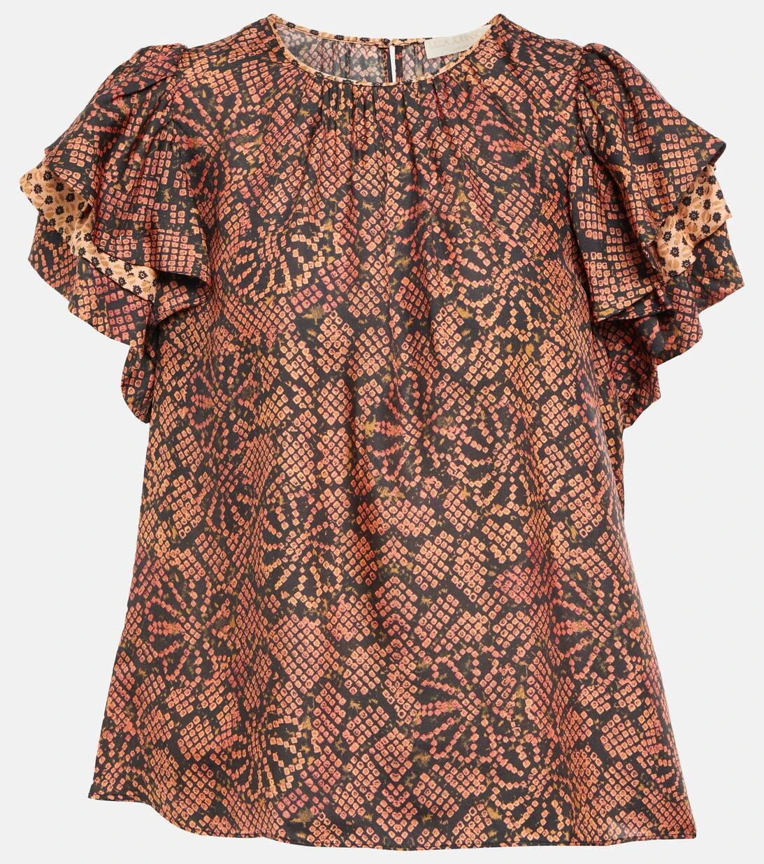 Das Josefine Top von Ulla Johnson wurde aus federleichtem Twill aus einem Seidengemisch gefertigt und mit einem auffälligen Blumenmotiv sowie gestuften Rüschenärmeln versehen.