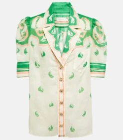 Setzen Sie mit dem High Tide Sailboats Hemd auf die verspielte Vision von Zimmermann für moderne Weiblichkeit. Dieses Design aus leichter Ramie ist Teil der Resort 2023 Kollektion und verfügt über gepuffte Schultern, ein fallendes Revers und ein geometrisches Muster.